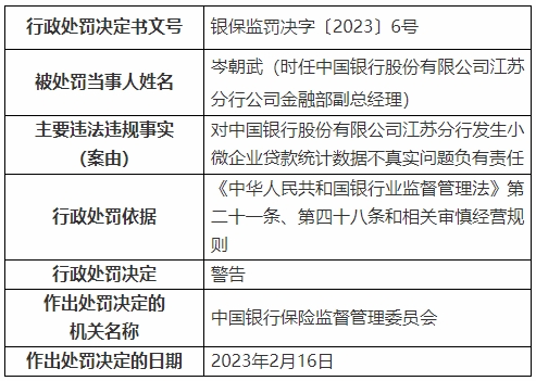 岑朝武时任中国银行股份有限公司江苏分行公司金融部副总经理,对中国银行股份有限公司江苏分行发生小微企业贷款统计数据不真实问题负有责任。依据《中华人民共和国银行业监督管理法》第二十一条、第四十八条和相关审慎经营规则,中国银行保险监督管理委员会对其警告。