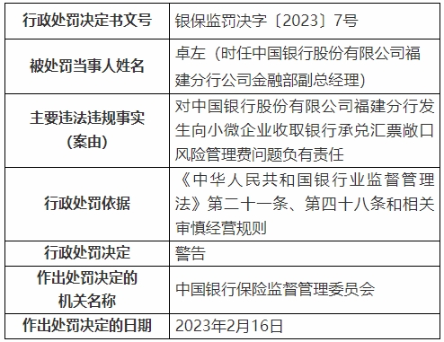 卓左时任中国银行股份有限公司福建分行公司金融部副总经理,对中国银行股份有限公司福建分行发生向小微企业收取银行承兑汇票敞口风险管理费问题负有责任。依据《中华人民共和国银行业监督管理法》第二十一条、第四十八条和相关审慎经营规则,中国银行保险监督管理委员会对其警告。