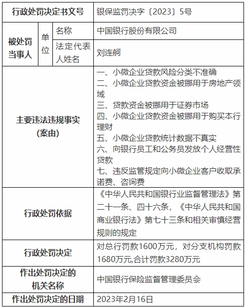 中国经济网北京2月18日讯 银保监会网站昨日公布的行政处罚信息公开表(银保监罚决字〔2023〕5、6、7号)显示,中国银行股份有限公司存在以下违法违规事实:一、小微企业贷款风险分类不准确;二、小微企业贷款资金被挪用于房地产领域;三、贷款资金被挪用于证券市场;四、小微企业贷款资金被挪用于购买本行理财;五、小微企业贷款统计数据不真实;六、向银行员工和公务员发放个人经营性贷款;七、违反监管规定向小微企业客户收取承诺费、咨询费。