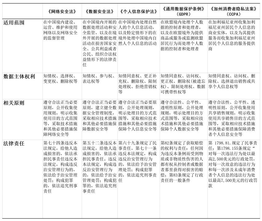 在现行法律法规方面,国内针对人工智能数据安全问题出台的相关法律法规主要有强调对基础设施及个人信息保护的网络安全立法、重点关注了数据安全保护和监管的数据安全法以及规范并促进个人信息的合理利用个人信息保护法。国外主要有赋予个人对自己的数据控制权的GDPR以及赋予消费者对自己的信息控制权的CCPA等。这些法律法规赋予个人对自己的数据控制权以及消费者对自己的信息控制权。为了更直观地分析它们之间的共性和不足,本文将对网络安全法、数据安全法、个人信息保护法、GDPR、CCPA结合五部法律具体的相关内容与规定,进行概要性的对比,见表1。