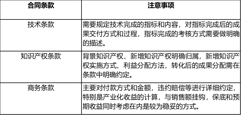 合同签署过程中,创新成果的产品价值、商业价值和学术价值均需要在合同条款中得以体现,技术条款、知识产权约定和商务条款等维度也需做出详细的约定。