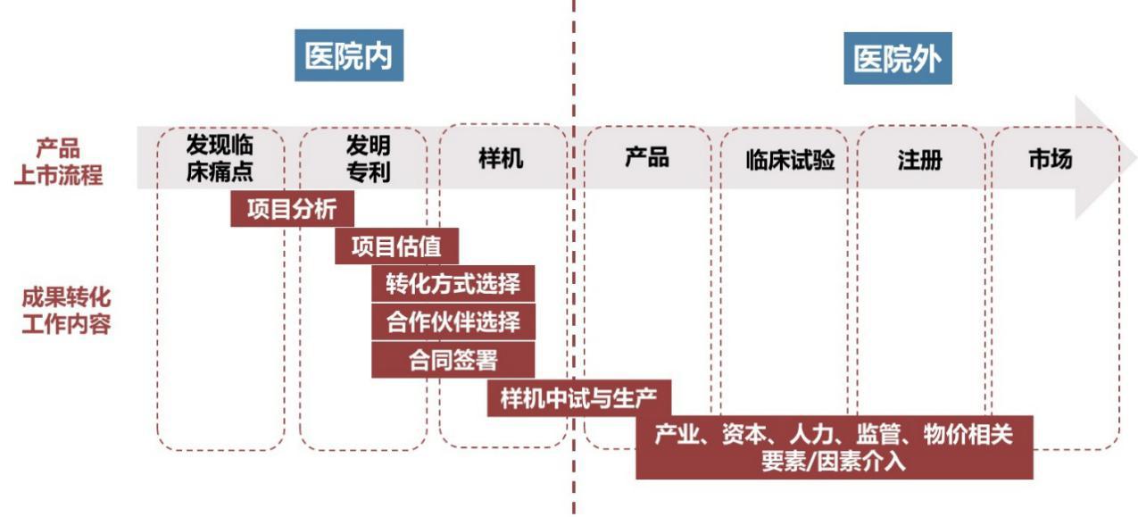 从发现临床痛点到走向市场落地应用,成果转化需要经过申请专利、样机、产品、临床试验、注册和市场营销等过程,过程漫长而复杂,其中能从发现临床痛点做成样机,已经是一般医院能做到的极限。成果转化过程中涉及到项目分析、估值、转化方式和伙伴选择与合同签订、样机中试与生产等工作,以及产业、资本、人力、监管、物价等多项相关要素的对接等, 需要系统专业的服务体系来支撑。