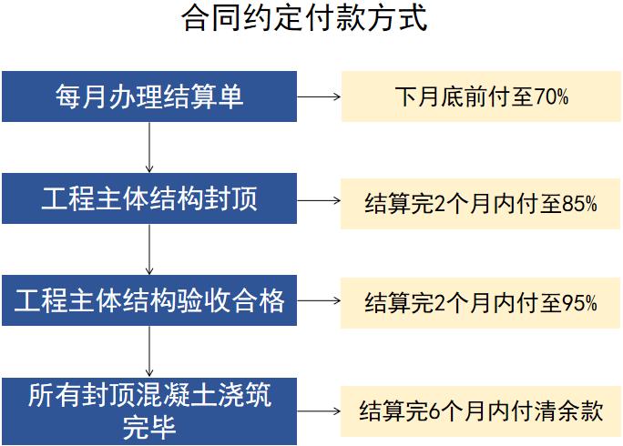 2019年7月,A公司(注册于河南省的民企)与B集团公司(注册于上海的国企)签订3份混凝土采购合同及补充协议,合同约定B集团公司向A公司购买商品混凝土,用于B集团公司承建河南当地的某个公园项目。付款方式为每月办理结算单,下月底前付70%,工程主体结构封顶结算后二个月内支付至85%,主体结构验收合格结算完二个月内支付至95%,余款5%在所有封顶混凝土浇筑完毕办理完结算六个月内结清。