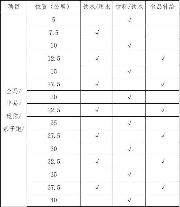 2.能量补给站:在比赛沿途的12.5公里、17.5公里、22.5公里、27.5公里、32.5公里、35公里、37.5公里以及半程和全程终点处设置能量补给站。