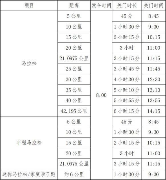 为了保证参赛选手比赛安全、顺利,限时对社会交通进行滚动封闭。比赛路线各段设有赛时关门时间,到了关门时间,相应公里点的计时地毯停止工作,相应路段将恢复社会交通。在规定关门时间内,未跑完对应距离的参赛选手必须立即停止比赛,并退出赛道,以免发生危险。退出比赛的选手可搭乘组委会提供的收容车抵达终点区域或自行选乘公共交通离开(不得通过终点领取完赛物品)。