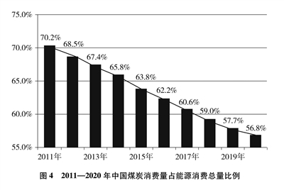 能源消费结构向清洁低碳加速转化。为应对化石能源燃烧所带来的环境污染和气候变化问题,中国严控煤炭消费,煤炭消费占比持续明显下降。2020年中国能源消费总量控制在50亿吨标准煤以内,煤炭占能源消费总量比重由2005年的72.4%下降至2020年的56.8%。中国超额完成“十三五”煤炭去产能、淘汰煤电落后产能目标任务,累计淘汰煤电落后产能4500万千瓦以上。截至2020年底,中国北方地区冬季清洁取暖率已提升到60%以上,京津冀及周边地区、汾渭平原累计完成散煤替代2500万户左右,削减散煤约5000万吨,据测算,相当于少排放二氧化碳约9200万吨。
