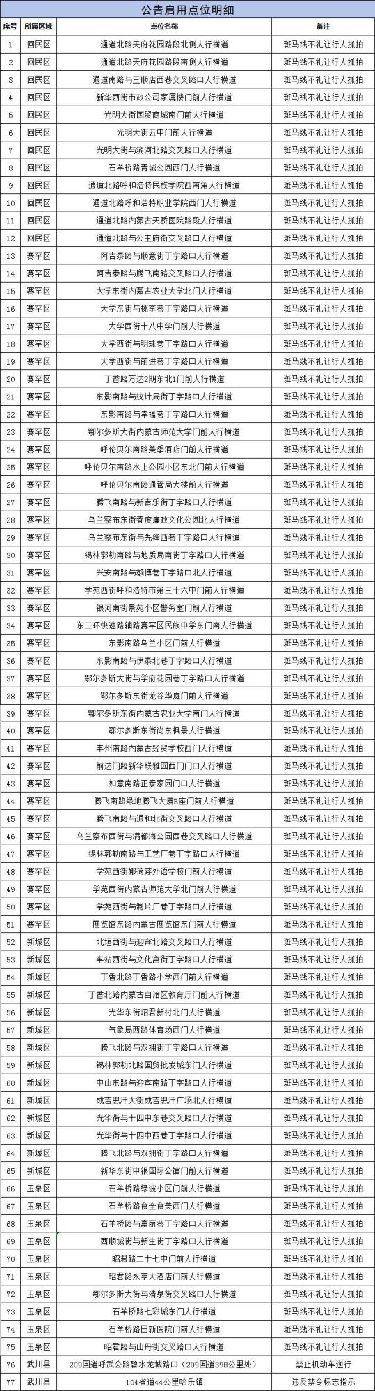 为进一步提升首府道路交通管理水平,创造良好交通环境,呼和浩特市对城区道路及公路交通技术监控系统进行了升级改造。根据《中华人民共和国道路交通安全法》、《中华人民共和国道路交通安全法实施条例》、公安部《道路交通安全违法行为处理程序规定》等法律、法规规定,以下交通技术监控系统(电子警察)已达到规范要求,呼和浩特市公安局交管支队决定自2024年1月23日零时正式启用。