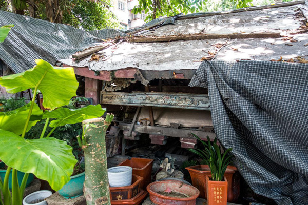 拆除前的茶亭庵(摄于2006年4月),和拆除后堆放在路边的茶亭庵部分构件(摄于2015年10月)