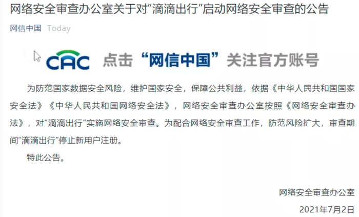 2021年7月2日晚间,网络安全审查办公室发布公告,宣布启动对“滴滴出行”的网络安全审查。通知很简单,但信息量巨大: