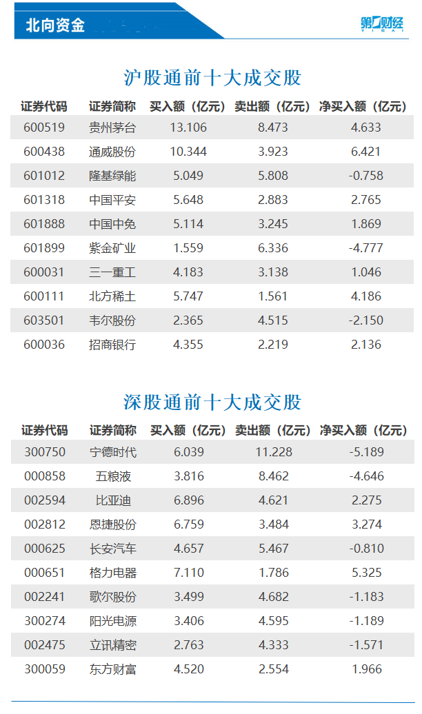 6月21日,北向资金全天净卖出10.62亿元;其中,沪股通净买入9.24亿元,深股通净卖出19.86亿元。前十大成交股中,通威股份、格力电器、贵州茅台净买入额位列前三。宁德时代、紫金矿业、五粮液净卖出额位列前三。