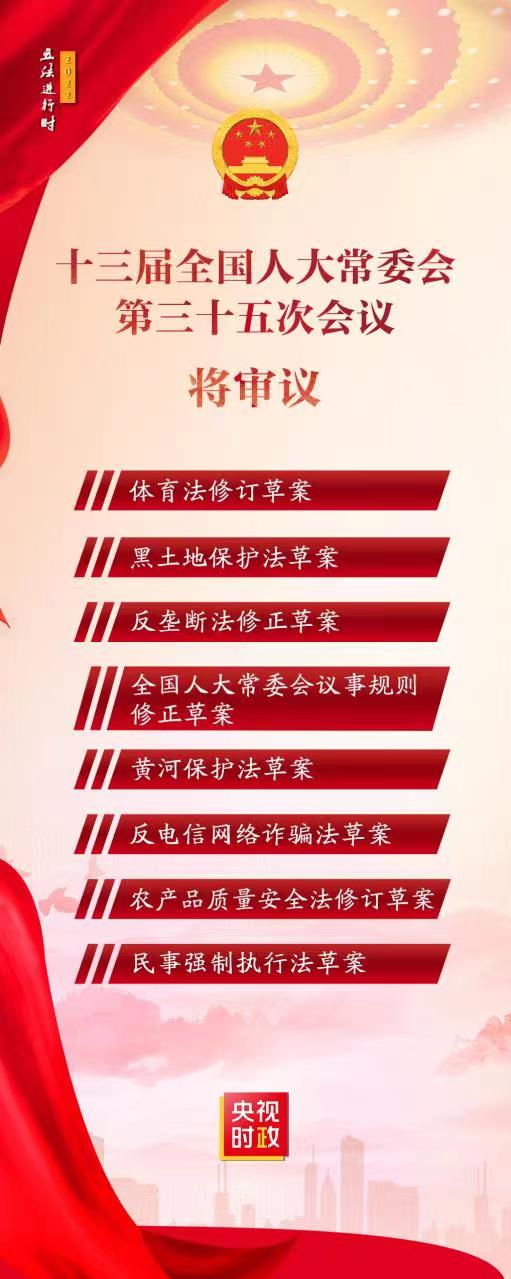 十三届全国人大常委会第三十五次会议21日下午在京开幕。黑土地保护法草案、反垄断法修正草案、反电信网络诈骗法草案等多件法律草案提请会议审议。(央视新闻)