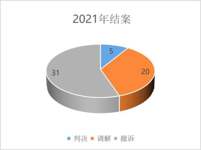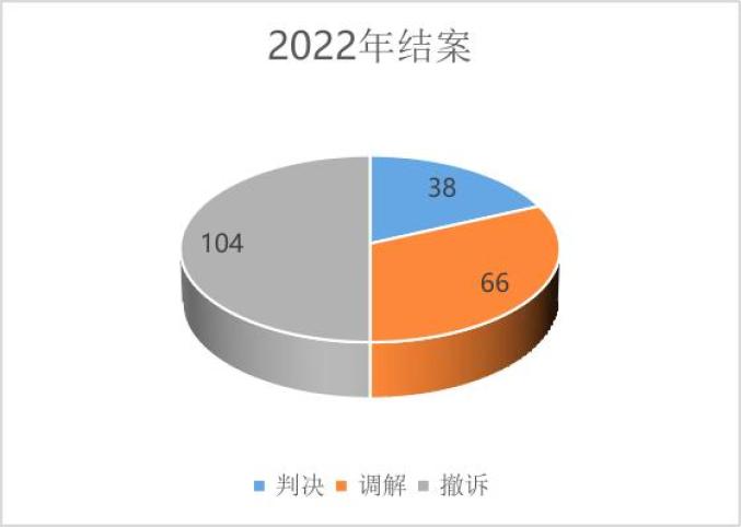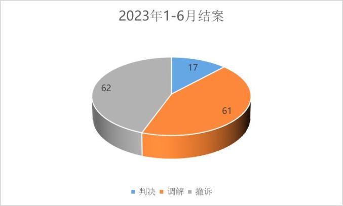 从结案方式看,2021年合计结案56件,其中判决结案5件(上诉4件)、调解结案20件、撤诉结案31件,调撤率为91.07%,判决案件上诉率为80%。2022年合计结案208件,其中判决结案38件(上诉5件)、调解结案66件、撤诉结案104件,调撤率为81.73%,判决案件上诉率为13.16%(详见图2)。2023年1-6月合计结案149件,其中判决结案17件(上诉0件)、调解结案61件,调解率为40.94%,撤诉结案62件,撤诉率为41.61%。