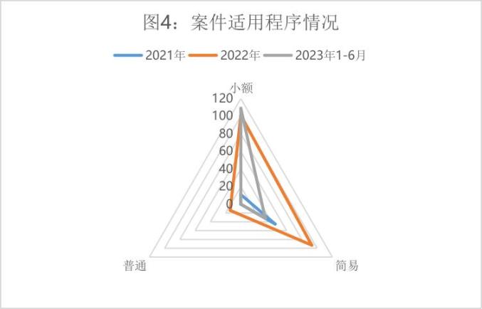 2021年审结的快递服务合同纠纷案件中,适用小额诉讼程序、简易程序、普通程序纠纷案件分别为11件、45件、0件,2022年审结的快递服务合同纠纷案件中,适用小额诉讼程序、简易程序、普通程序纠纷案件分别为101件、93件、14件(详见图4)。2023年1-6月审结的快递服务合同纠纷案件中,适用小额诉讼程序、简易程序、普通程序纠纷案件分别为109件、32件、0件,适用率由2021年的19.64%上升到2022年的48.56%,增幅明显。