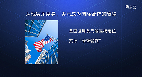 从这个角度上讲,我们本应该愿意跟谁做生意就跟谁做生意,但因为要使用美元,主权国家间的合作就受到限制。因此中国不得不跟美元保持一定距离,逐渐减少使用美元。