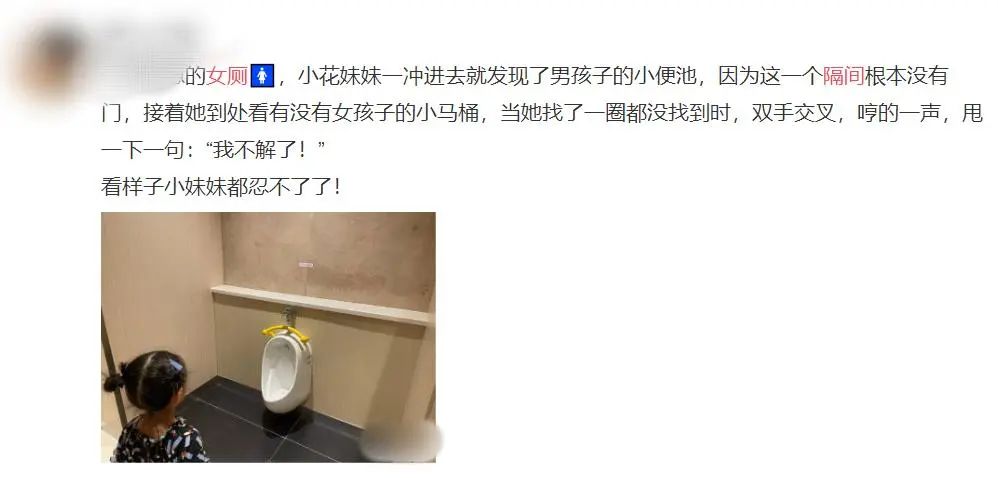 更有甚者,部分商场、景点等公共场所直接在女厕专门设置了男童的小便池,但却没有设置相应隔间,似乎变相默许男童如女厕。