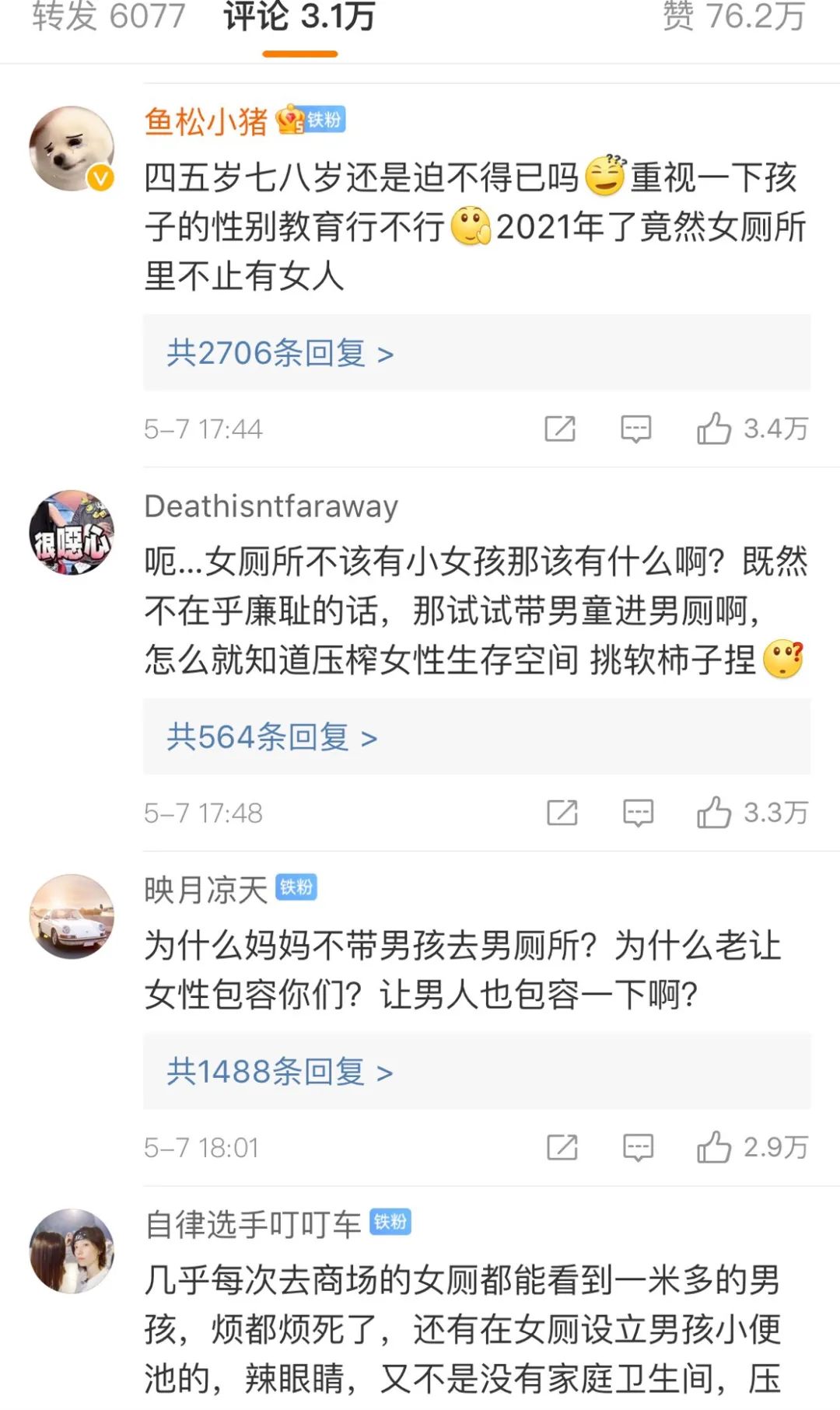 有的女性还表示,在公共女厕遇到过男童敲门、扒门缝等行为,伤害了自己的合法权益。于是,不少网友在相关话题下评论,认为这些做法侵犯了其他女性的隐私,实在是“不妥当”。