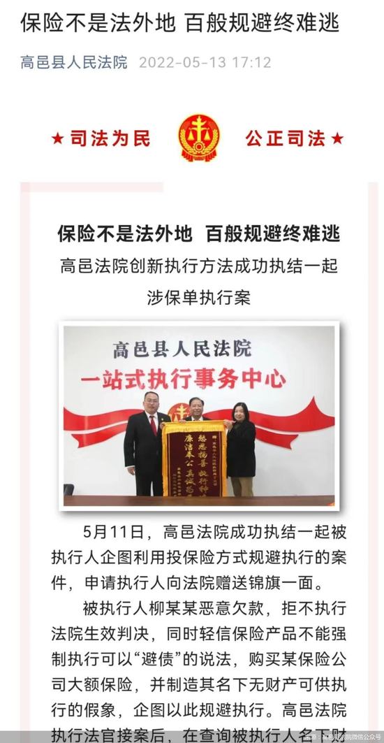 案例显示,被执行人柳某某恶意欠款,拒不执行法院生效判决,同时轻信保险产品不能强制执行可以“避债”的说法,购买某保险公司大额保险,企图以此规避执行。高邑县法院执行法官接案后终于发现柳某某在某保险公司投入大额保险,保险单价值21万余元。最终从柳某某保单收益中提取8万元偿还欠款。