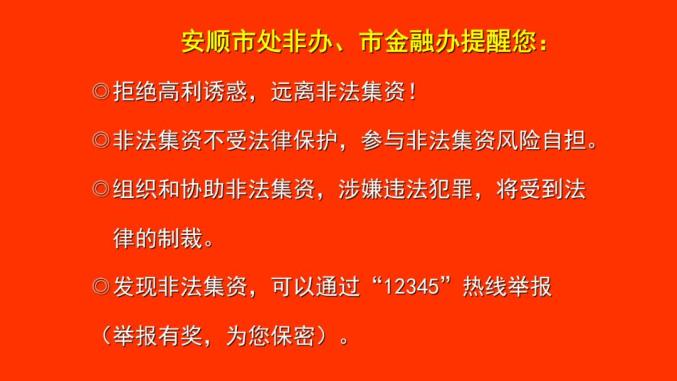 安顺市处非办、市金融办提醒您:拒绝高利诱惑,远离非法集资!非法集资不受法律保护,参与非法集资风险自担。组织和协助非法集资,涉嫌违法犯罪,将受到法律的制裁。发现非法集资,可以通过“12345”热线举报(举报有奖,为您保密)。