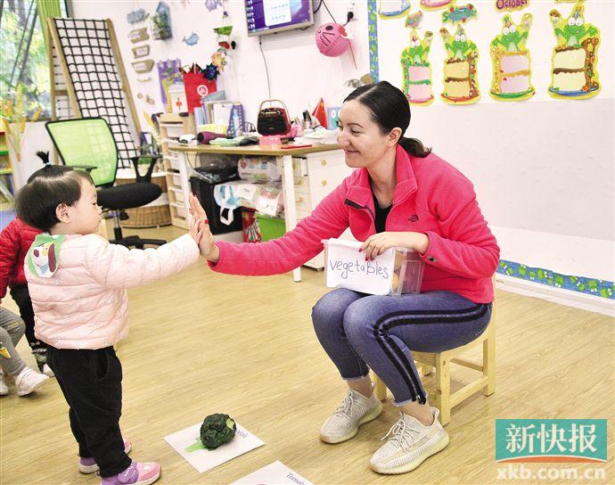 新快报记者在走访唐尼翰博国际保育园越秀分园时,其1-2岁班级的十多名幼儿正在上外教课。一名外教拿着各类水果的模型,用简单的单词与夸张的动作,来吸引孩子们的注意。“其实主要是创造一个语感环境。”崔珍梅表示,这一阶段的孩子对动作比较敏感,主要是通过看进而进行听与模仿。