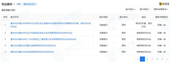 启信宝信息还显示,2021年6月以来,潼关肉夹馍协会以“侵害商标权纠纷”“商标权权属、侵权纠纷”等理由起诉了上百家小吃店、食品店、美食店。这些被起诉的小吃店分布全国各地,有的是河南焦作的,有的来自浙江杭州,有的则是广东佛山的。