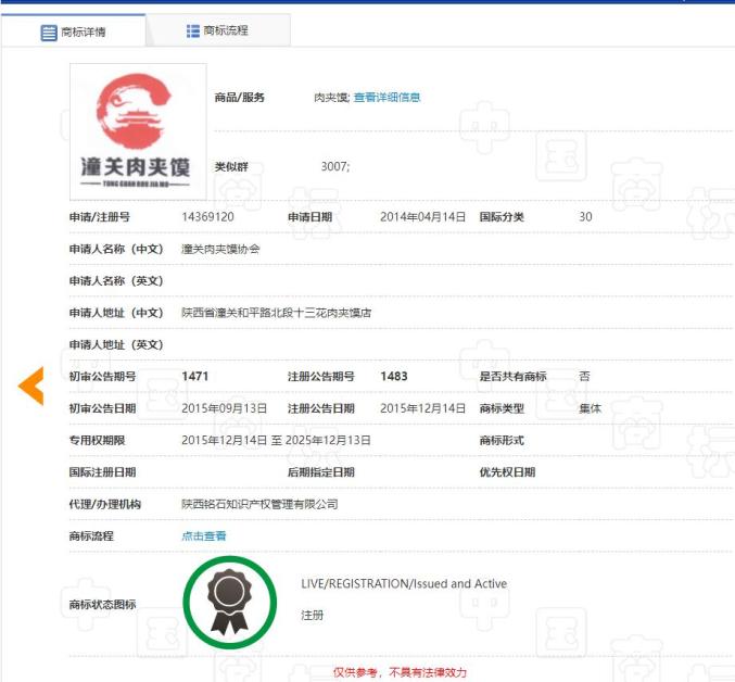 国家知识产权局商标局中国商标网信息显示,老潼关小吃协会于2014年4月14日申请注册了“潼关肉夹馍”商标。该商标的国际分类为“30-方便食品”,注册公告日期为2015年12月14日,专用权期限从2015年12月14日至2025年12月13日,商标类型为集体商标。