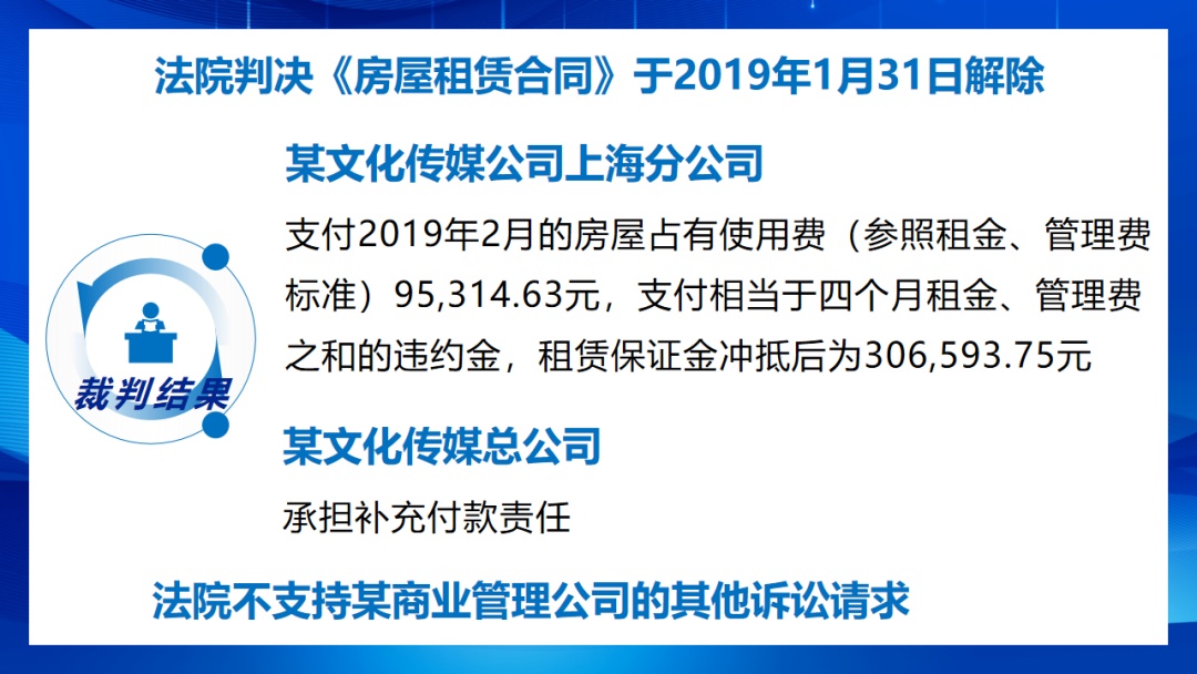 上海市第二中级人民法院判决合同于2019年1月31日解除,并判决某文化传媒公司上海分公司支付2019年1月的租金及使用费,并支付2019年2月的房屋占有使用费(参照租金、管理费标准)95,314.63元,支付相当于四个月租金、管理费之和的违约金,租赁保证金冲抵后为306,593.75元,某文化传媒总公司承担补充付款责任。