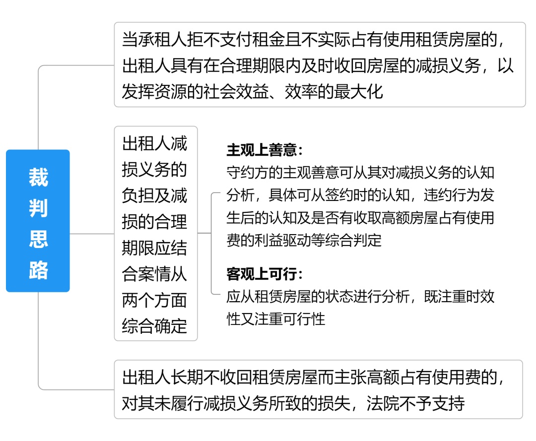 对出租人的减损义务的负担及减损的合理期限的确定应结合案情从主观上善意、客观上可行两个方面综合确定。其中,守约方的主观善意可从其对减损义务的认知分析,具体可从签约时的认知,违约行为发生后的认知及是否有收取高额房屋占有使用费的利益驱动等综合判定。客观上可行应从租赁房屋的状态进行分析,既注重时效性又注重可行性。出租人长期不收回租赁房屋而主张高额占有使用费的,对其未履行减损义务所致的损失,法院不予支持。
