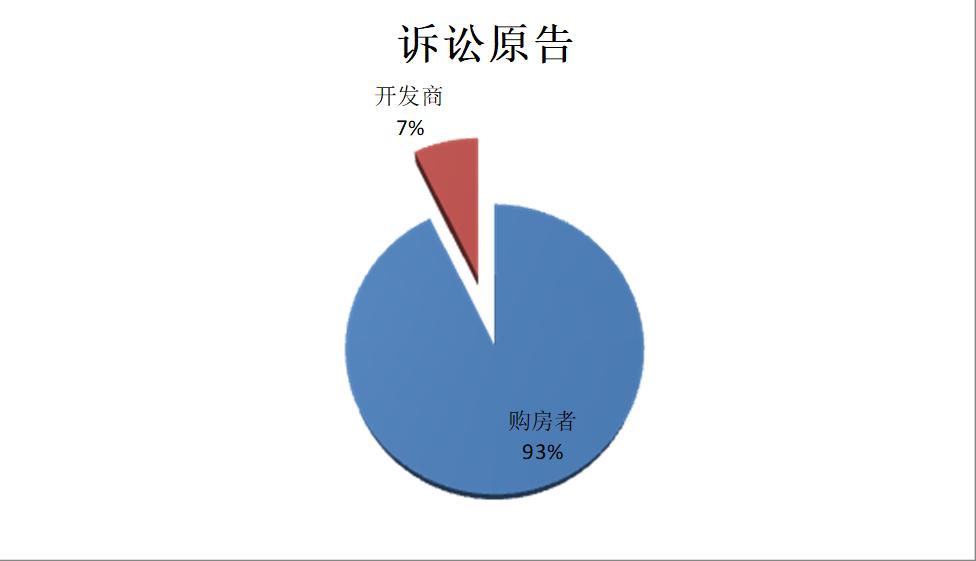 从已受理的案件当事人来看,商品房买卖纠纷案件多为卖方违约引起,原告为购房者的案件占总案件数的92.7%;仅有少部分案件起诉主体为开发商,多因实际交房面积比合同约定面积大,要求补缴购房款,此类案件占商品房销售合同纠纷的7.3%。
