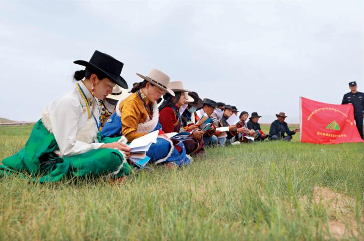 >>2022年7月12日,在玛多县冬格措纳湖畔,当地牧民群众在听玛多县人民法院巡回法庭法律宣讲。 新华社发
