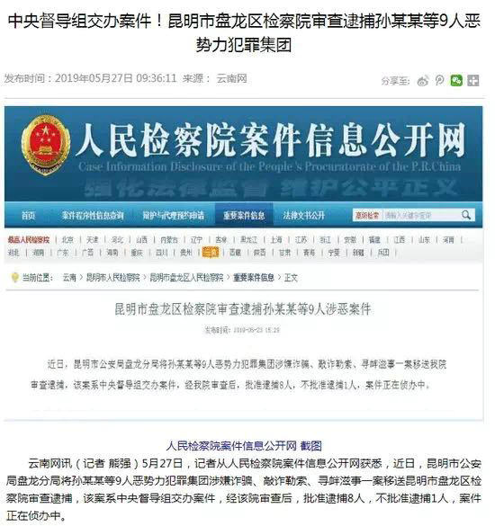 5月27日,记者从人民检察院案件信息公开网获悉,近日,昆明市公安局盘龙分局将孙某某等9人恶势力犯罪集团涉嫌诈骗、敲诈勒索、寻衅滋事一案移送昆明市盘龙区检察院审查逮捕,该案系中央督导组交办案件,经该院审查后,批准逮捕8人,不批准逮捕1人,案件正在侦办中。