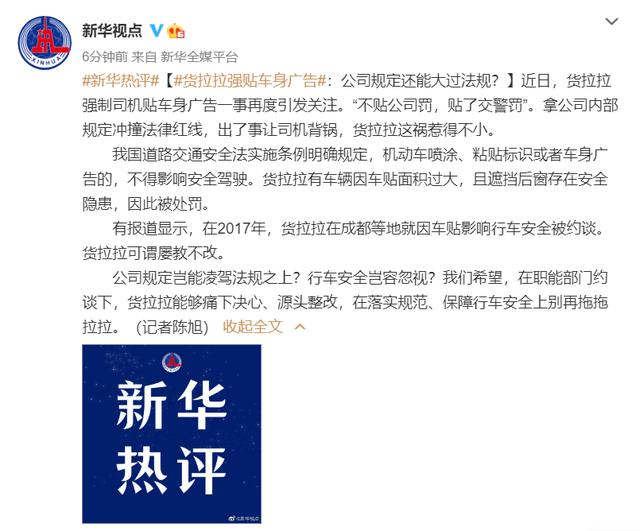 公司规定岂能凌驾法规之上?行车安全岂容忽视?我们希望,在职能部门约谈下,货拉拉能够痛下决心、源头整改,在落实规范、保障行车安全上别再拖拖拉拉。