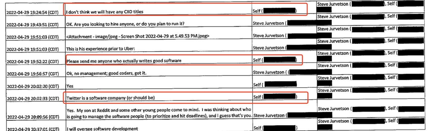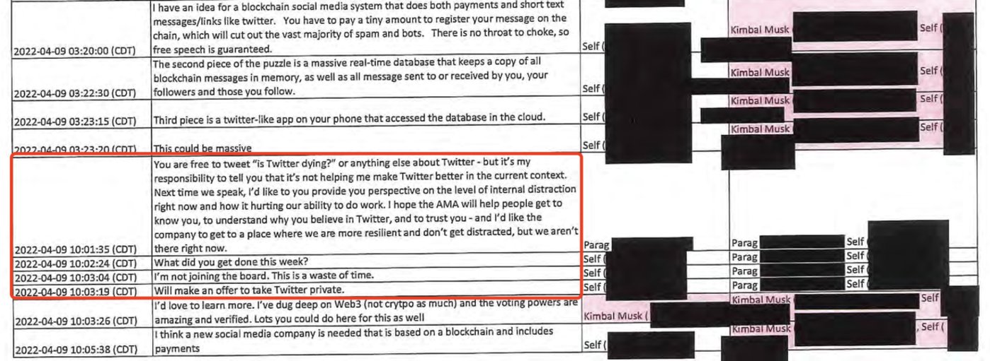 原本这起案件会在10月17日有一场庭审,随着马斯克的新提议拖延到10月28日。9月28日,法院公布了一份151页取证材料,里面记载了马斯克与他的硅谷富豪圈关于这次并购私密的短信聊天记录,这些信息非常精彩。