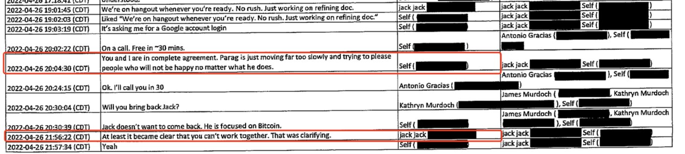 张伟华:其实从他短信往来记录来看,一开始他跟Twitter的CEO Parag Agrawal 还是比较友好的,但是就是 Parag 对他进行了 Question(质疑)之后,变得非常的敌对了,也可能在他心目中他未必是真正看得上Parag的。