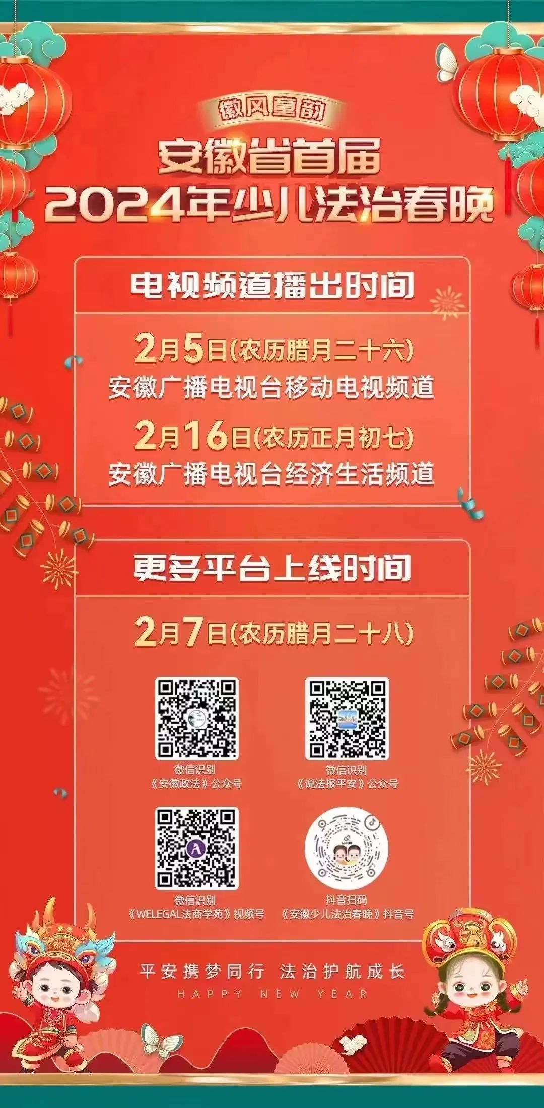 育人以法,润物无声。为系好青少年“第一颗法治扣子”,让孩子们在欢声笑语中学习法律知识,以“平安携梦童行,法治护航成长”为主题的安徽省2024年首届少儿法治春晚上线开播。