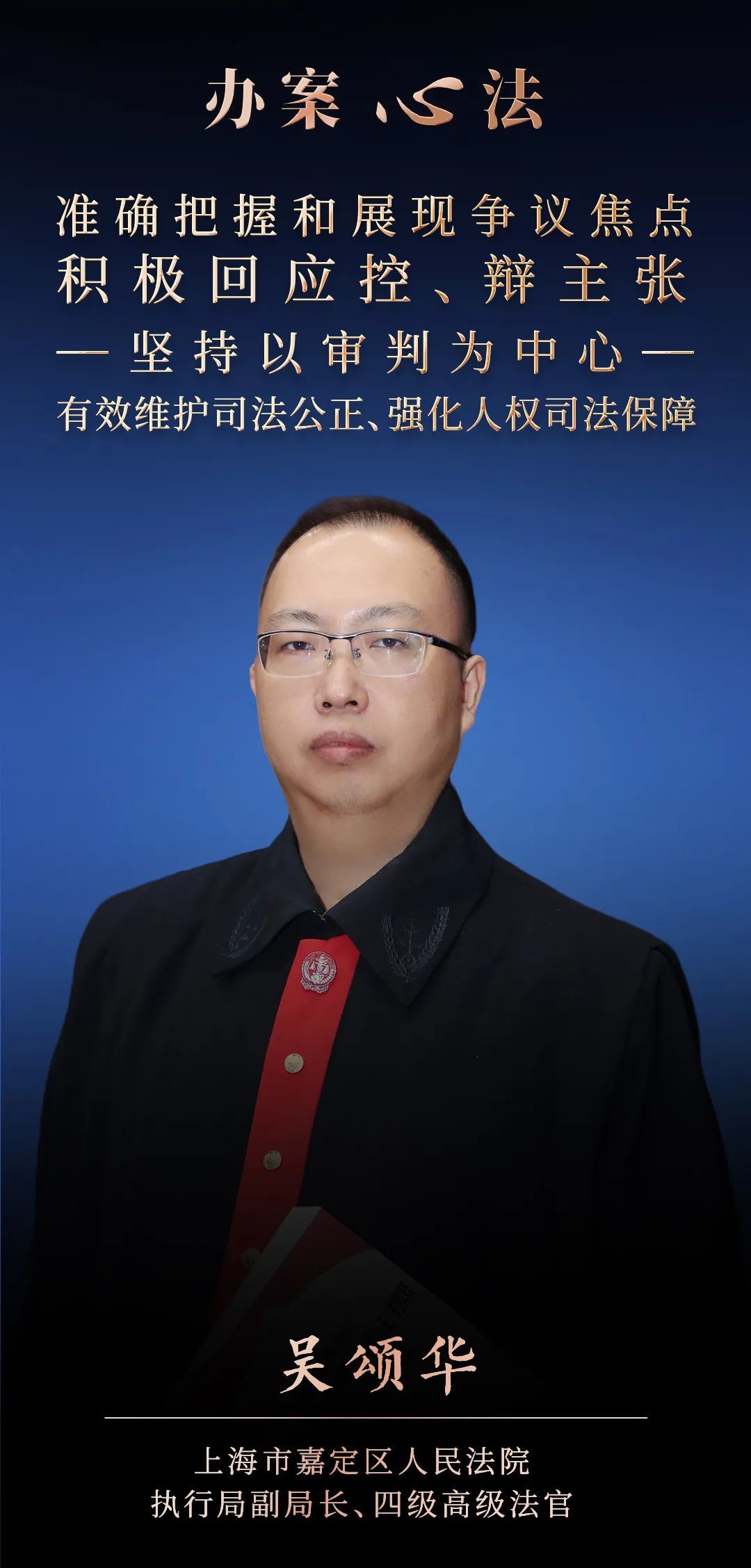 本期“办案心法”栏目“上海法院审判业务骨干”特别专题,邀请上海法院“邹碧华式的好法官、好干部”、审判业务骨干,上海市嘉定区人民法院执行局副局长、四级高级法官——吴颂华为我们讲解刑事法官如何准确把握和展现争议焦点。