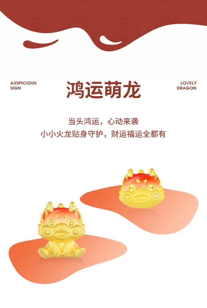 龙年到来之际,周大生也重磅推出以中国传统十二生肖中“龙”作为设计元素,并且目前已稳居行业top1的生肖龙产品。First生肖龙转运珠以无边框渐变果冻珐琅为工艺点,“火龙果”转运珠以红色珐琅寓意吉祥如意,红红火火;“小粉龙“转运珠粉头粉脑,精致粉嫩;“小青龙”转运珠寓意青龙送福,财富双满足。既满足了消费者对高颜值的产品要求,本命年转运的产品寓意又契合了年轻人群的心理期待,体现了周大生对产品的独特匠心。LongLong五福龙 则是以五个 超能力:喜乐、健康、丰收 、守护和幸福为产品概念 , 打造爱孩子 、爱父母 、 爱事业 、 爱自己和爱伴侣五个主题系列产品 , 传递长长久久的爱与希望 。自己佩戴或新年送礼,周大生的生肖龙产品都承载着满满的美好寓意,为每个人送上最真挚的祝福!