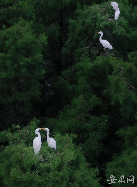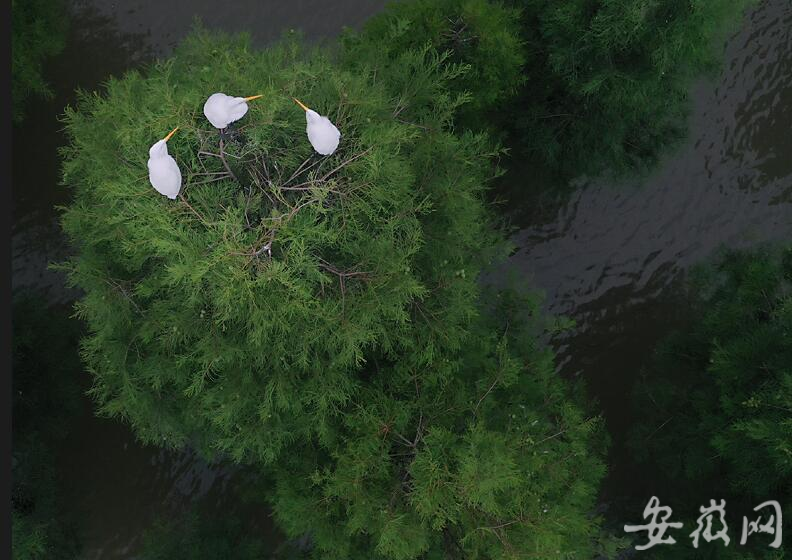 安徽网 大皖客户端讯   仲夏时节,位于合肥董铺水库湿地的一片水杉树林里,成百上千只白鹭在枝头嬉戏、休憩。近年来合肥市持续加大饮用水水源地保护力度,使得董铺水库周边湿地生态环境不断向好,引来大批鹭鸟栖息,绘就一幅人与自然和谐相处的绿色画卷。