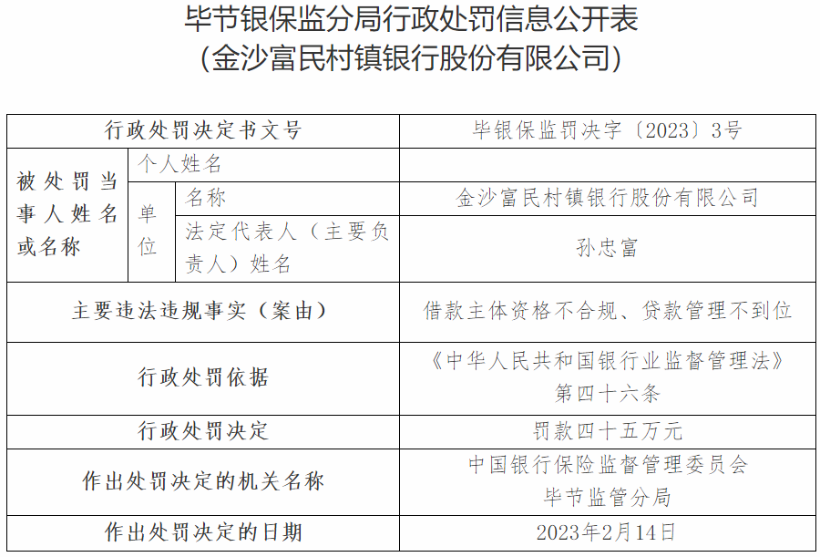 中国经济网北京2月24日讯 昨日,银保监会网站披露毕节银保监分局行政处罚信息公开表(毕银保监罚决字〔2023〕3号、4号、5号),金沙富民村镇银行股份有限公司存在借款主体资格不合规、贷款管理不到位的主要违法违规事实,依据《中华人民共和国银行业监督管理法》第四十六条,毕节银保监分局对其罚款四十五万元。