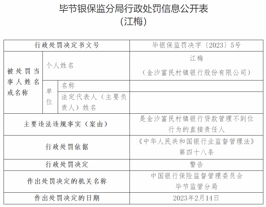 孙忠富作为金沙富民村镇银行借款主体资格不合规行为的直接责任人,依据《中华人民共和国银行业监督管理法》第四十八条,被处罚款五万元。江梅作为金沙富民村镇银行贷款管理不到位行为的直接责任人,依据《中华人民共和国银行业监督管理法》第四十八条,被处警告。