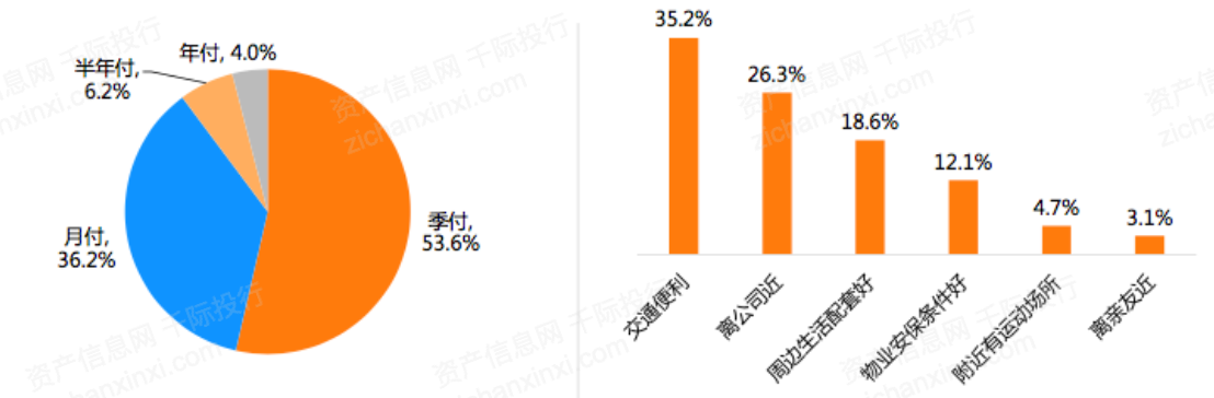 在用于支付租金的选择方式过程中,超过一半的用户选择季付,也有不少人选择月付租金,占比达到了36.2%,相比于季付和月付,半年付的用户比较少。