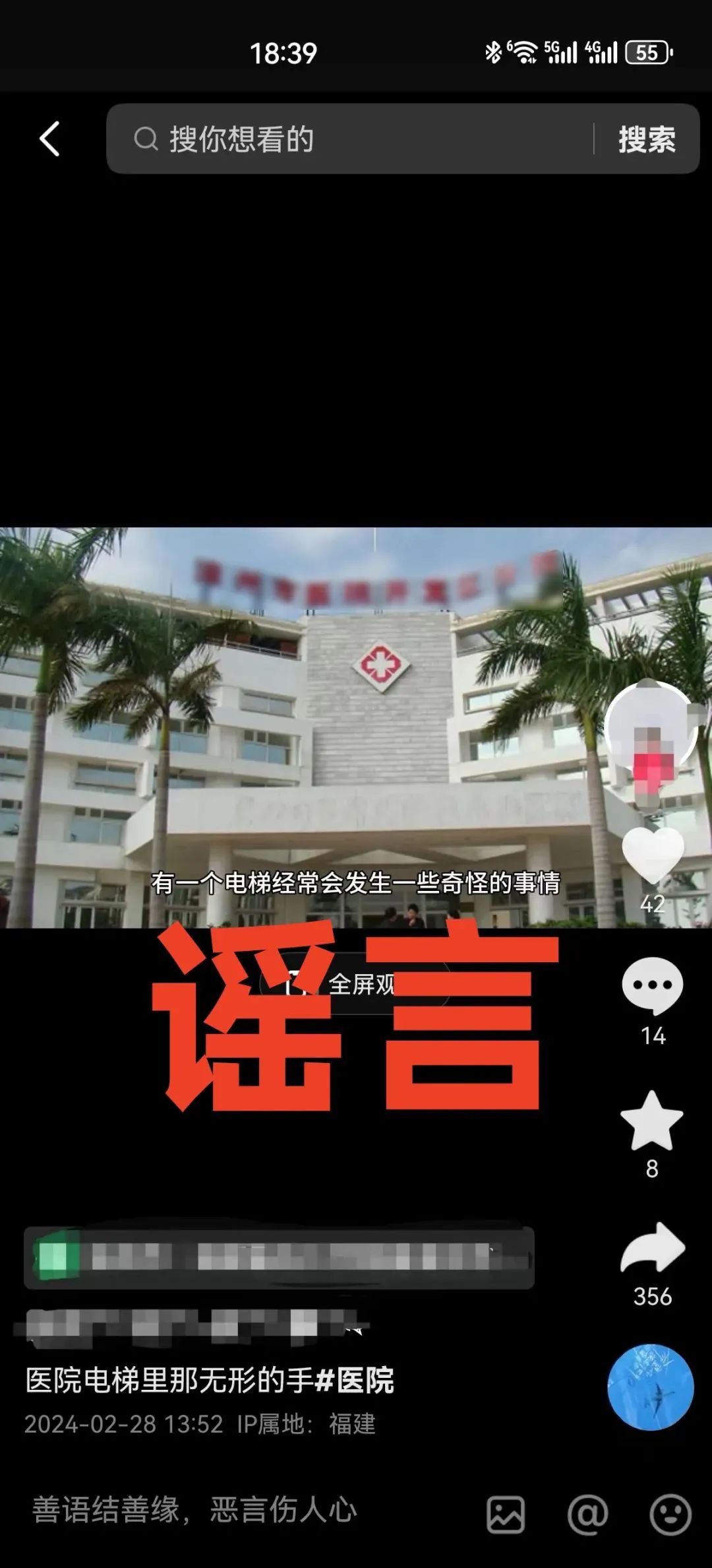 近日,网民蔡某在短视频平台发布“据说在漳州某医院,有一个电梯经常会发生一些奇怪的事情……”的图文视频,造成不良影响。经查,该视频内容均为虚构,行为人涉嫌制作、发布、传播散布谣言,扰乱公共秩序。