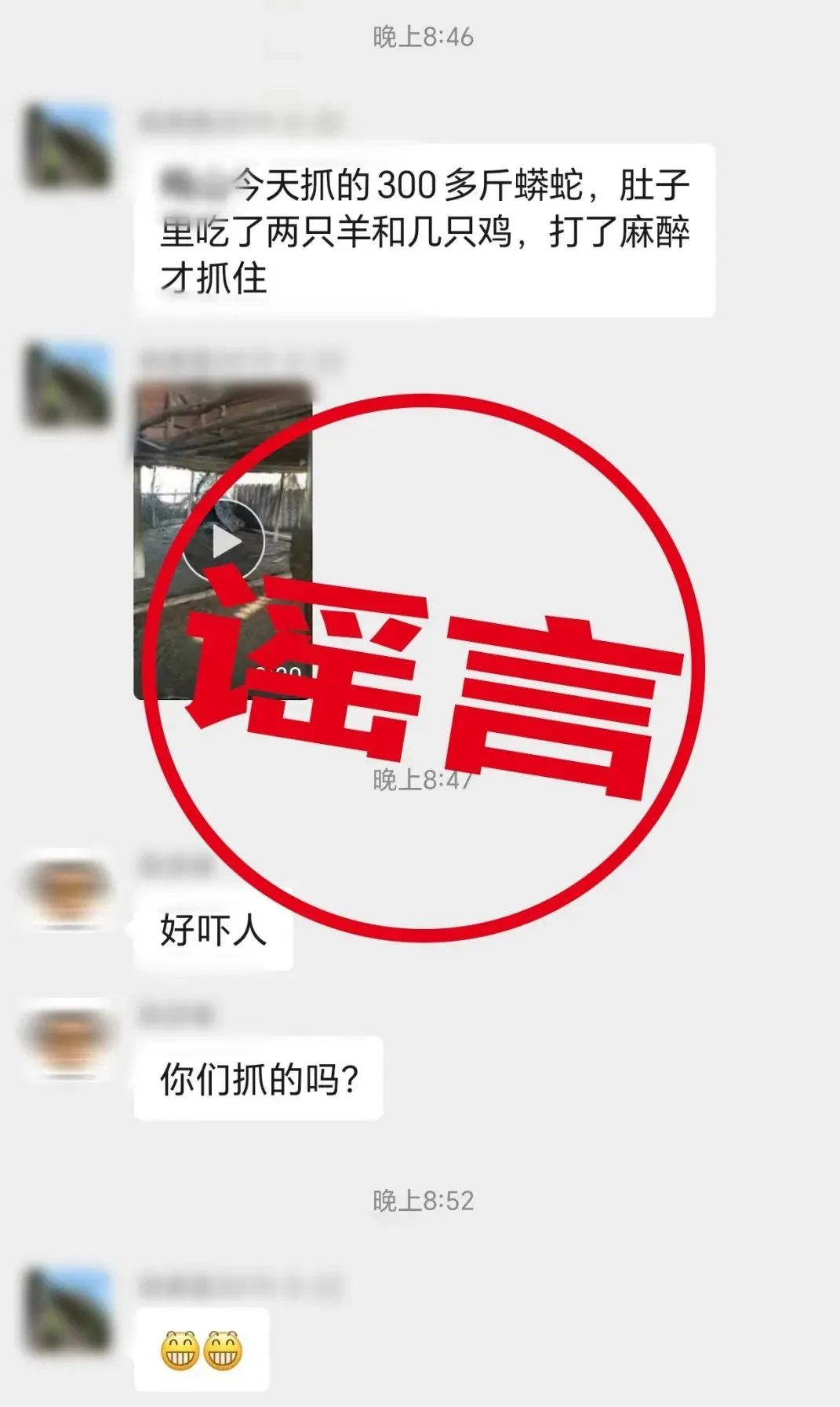 经核实,这是陈某道听途说福建某地捕获一条蟒蛇并放生的消息后,在未经核实的情况下,从网络上找到一条疑似AI生成的蟒蛇视频并对视频内容重新配文后,转发至微信群的谣言。
