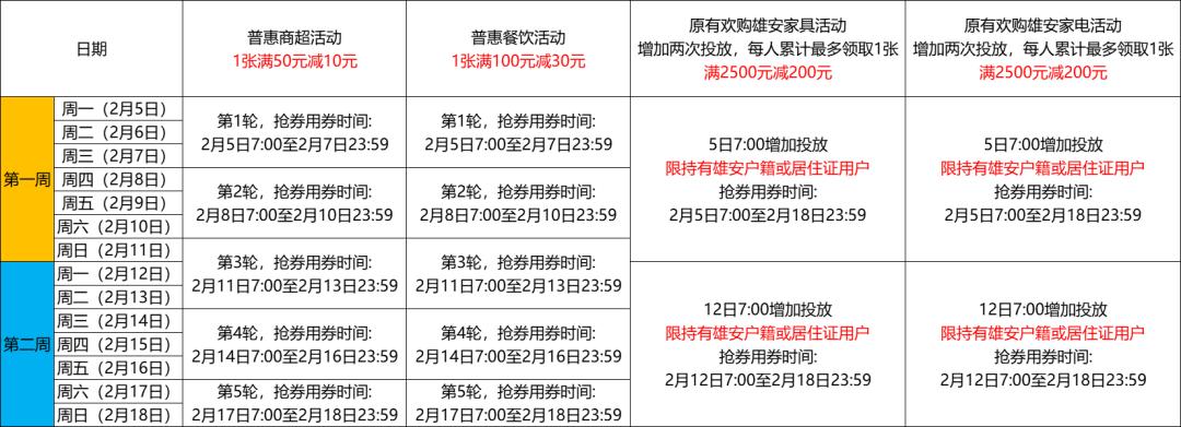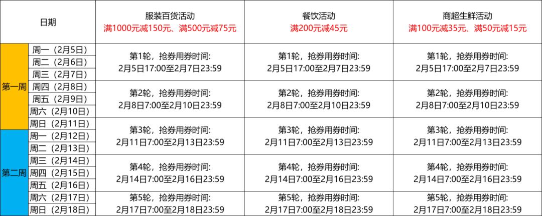 (3)家电、家具活动第一次增加投放时间为2月5日7:00,第二次增加投放时间为2月12日7:00,新投放的消费券与原有的第二轮欢购家电、家具消费券用券时间都到2月18日23:59结束。