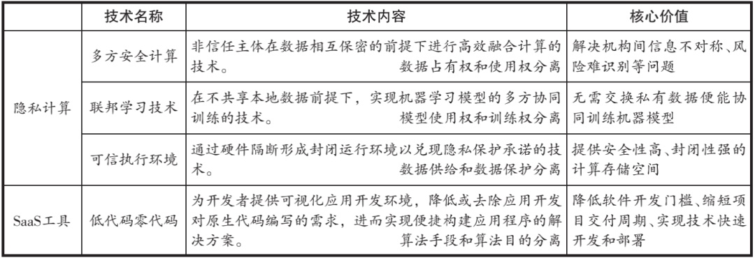 学界和实务界以数据合规科技的总称统摄一切在提供隐私保护前提下实现数据价值挖掘的应用手段,包括但不限于以多方安全计算、联邦学习、可信执行环境为代表的隐私计算技术以及以低代码、零代码为核心的“软件即服务”(SaaS)平台等。各项主流技术的内容和价值,如表1所示。