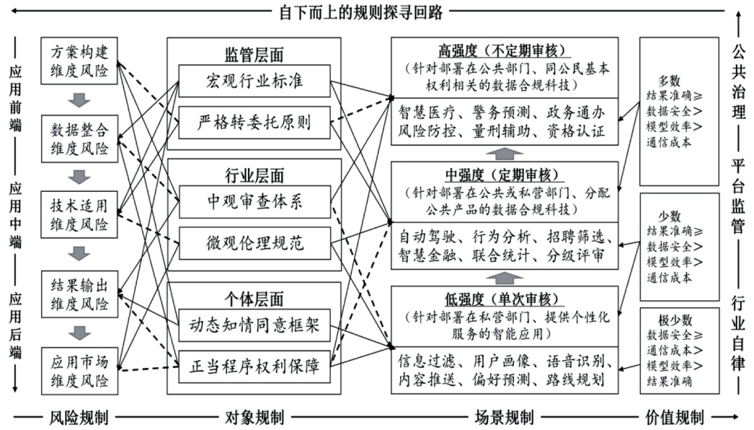 这一图式展示出了数据合规科技的动态规制体系,即以不同层面的法律规则为核心、各项规制要素同频共振的系统化规制模式。例如,对于智慧金融领域的数据合规科技,因为关涉公共产品的分配,计算结果的准确性和数据安全同等重要,宏观层面的行业标准如果偏重数据安全和应用流程的一体化规范,中观层面的外部审查体系就应当着重关注计算结果的公允程度及其对数据主体的潜在影响;为了缓解规制过程中工具理性和价值理性的冲突,个体层面的权利保障是对结果数据维度风险的补救和兜底。