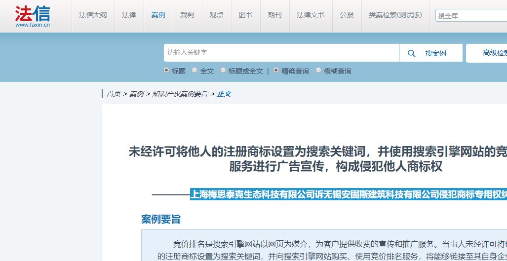 4.未经许可将他人的注册商标设置为搜索关键词,并使用竞价排名服务进行广告宣传,构成侵犯他人商标权——上海梅思泰克生态科技有限公司诉无锡安固斯建筑科技有限公司侵犯商标专用权纠纷案