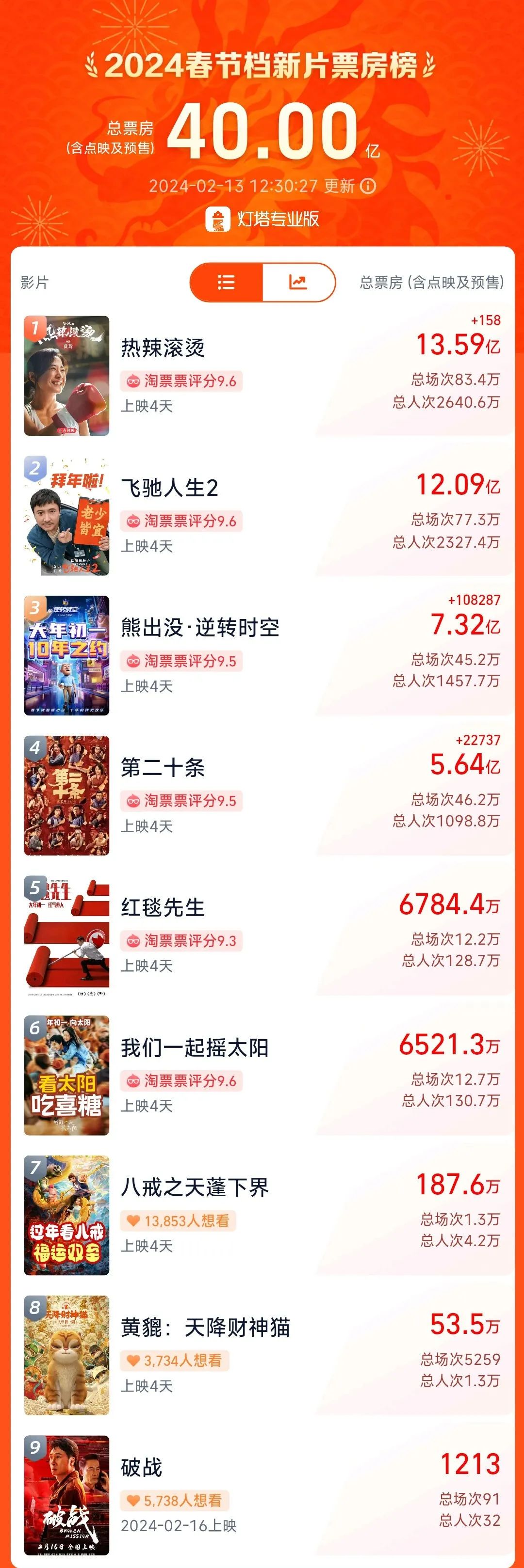 据网络平台数据显示(灯塔专业版数据),截至2月13日12时27分,2024年春节档(2月10日—2月17日)档期总票房(含预售)突破40亿!《热辣滚烫》《飞驰人生2》《熊出没·逆转时空》暂列档期票房前三位。