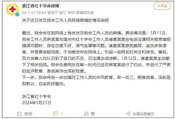 1月21日上午,浙江省红十字会、温州市红十字会就该事件先后发布通报