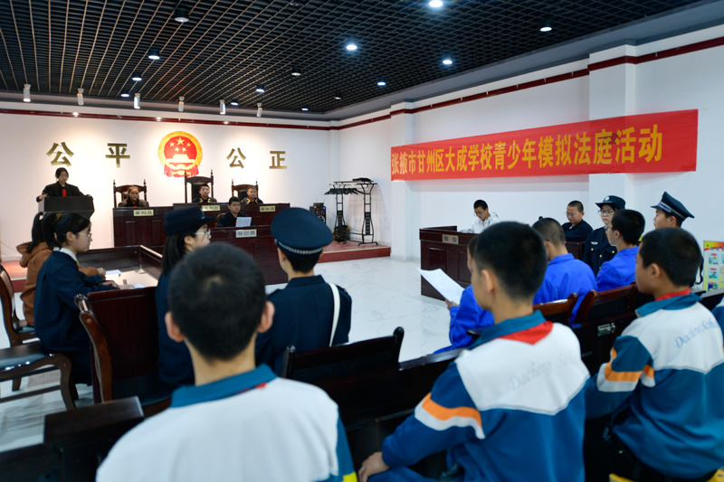 4月14日,在张掖市甘州区大成学校,学生们通过观看模拟法庭活动增强法制观念。