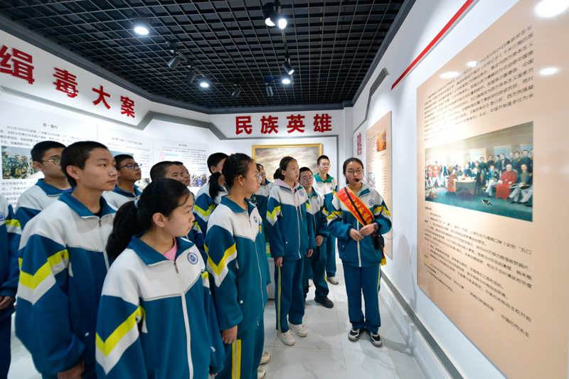 4月14日,在张掖市禁毒教育基地,学生们参观展览。
